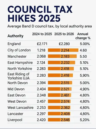 Other areas to see some of the largest hikes include Birmingham (7.4% or £154), North Somerset (6% or £130) and York (5.9% or £122).